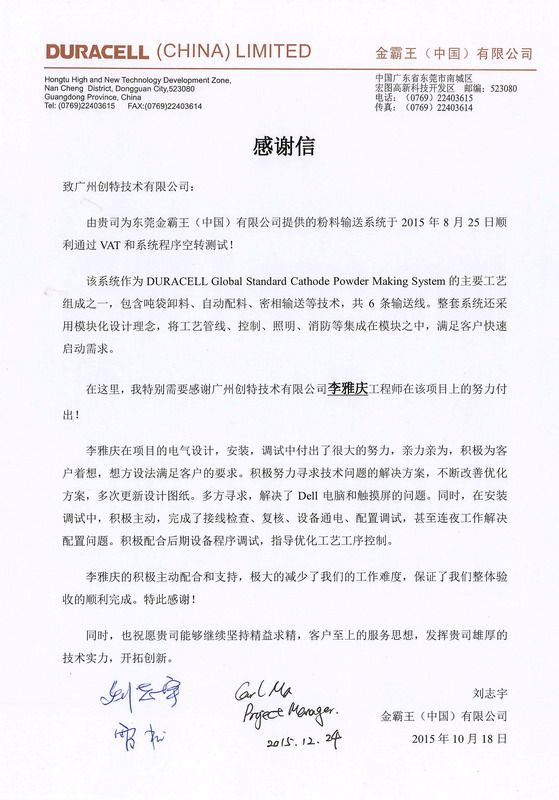 A Letter of Thanks from Duracell(China)