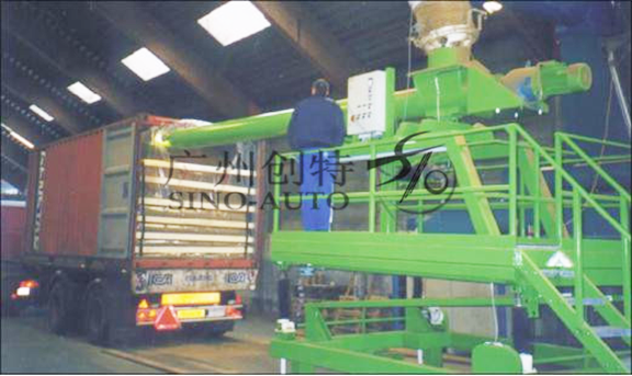通過筒倉(cāng)內(nèi)物料的重力加速度,把集裝箱填滿。10分鐘內(nèi)裝好一車,約25噸,效率極高。